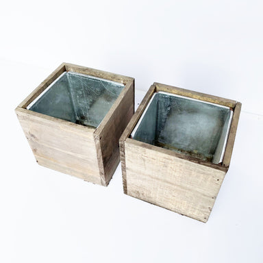Wooden cube lined with metal. No drainage hole - use as cachepot 4" diameter4" tall Fits a 4" pot