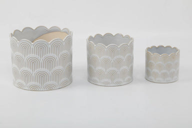 Glazed ceramic. Grey Small: 3.5" L x 3.5" W x 3" H Medium:5" L x 5" W x 4.25" H Large: 6.25" L x 6.25" W x 5" H